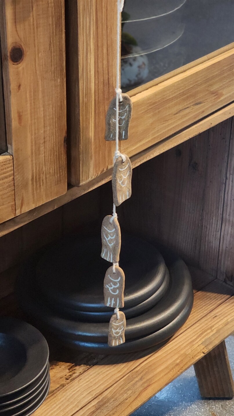 작은 도자기 물고기 다섯 마리를 실로 엮어