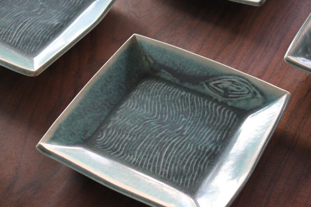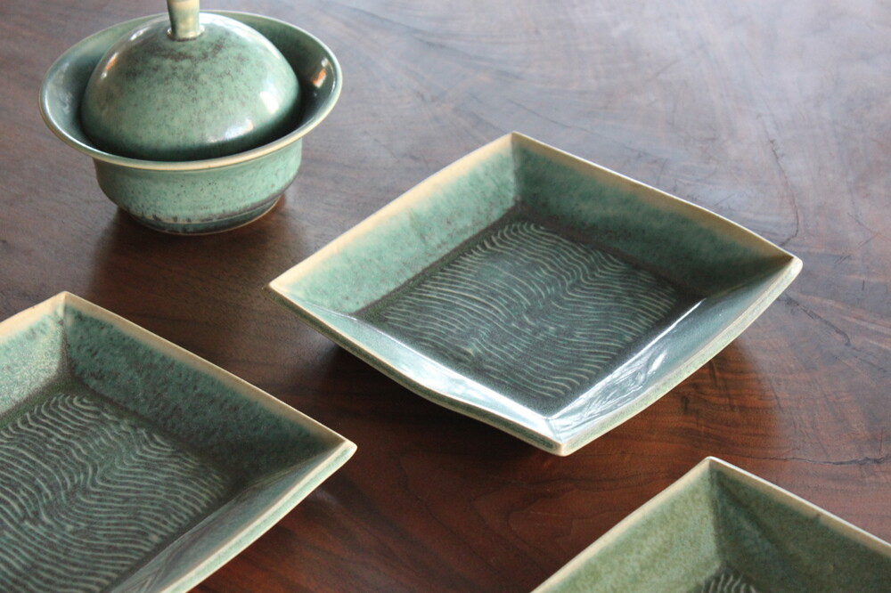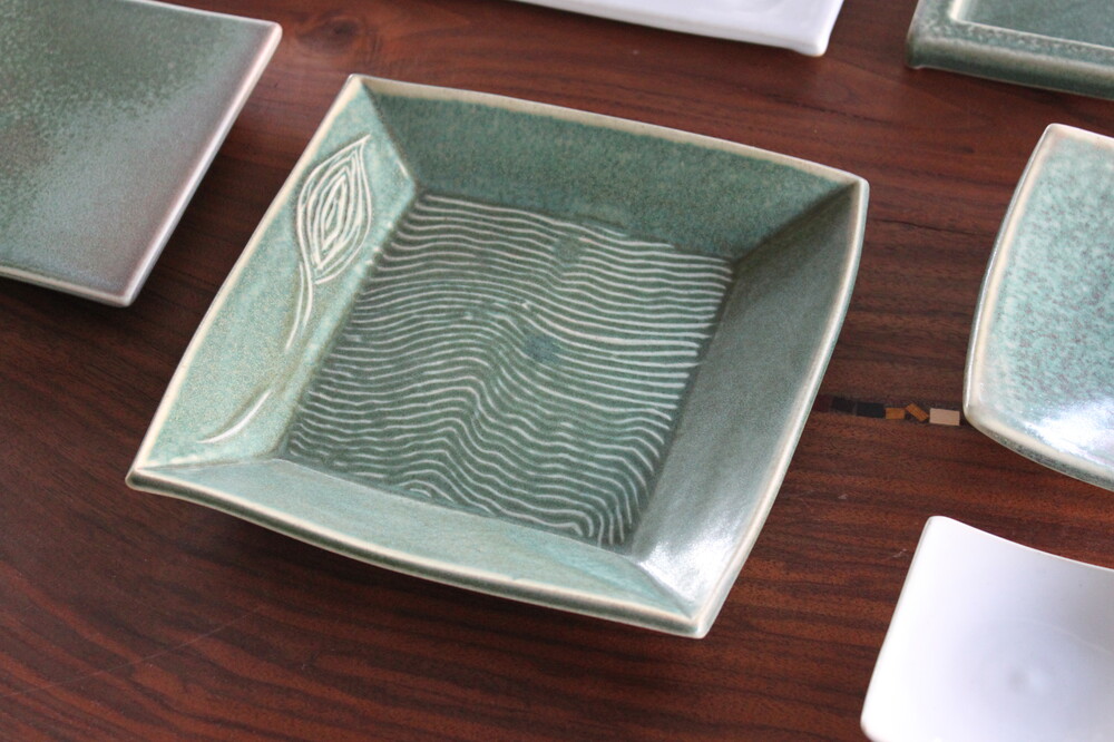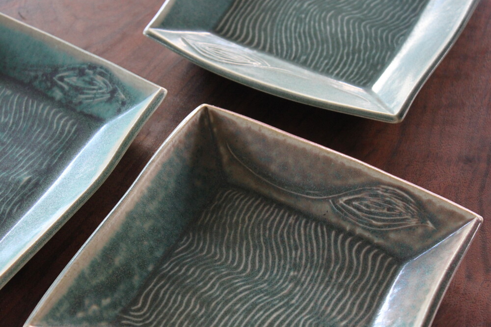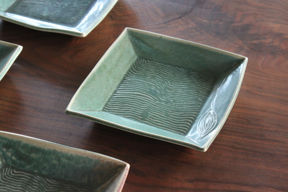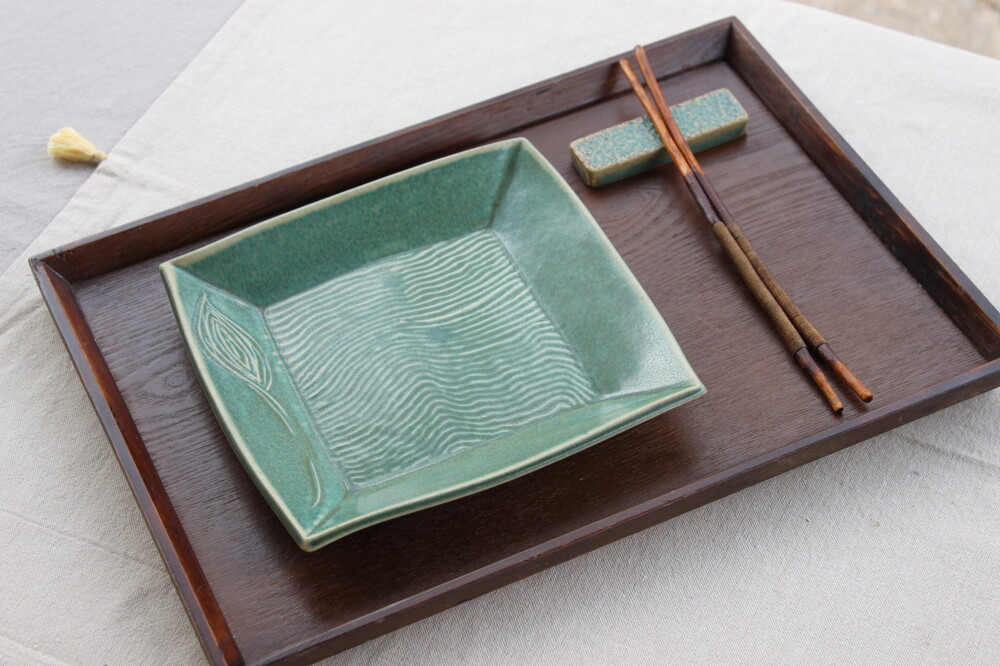 목련 꽃봉오리를 새겨놓은 깊은 그린색감의 사각접시입니다