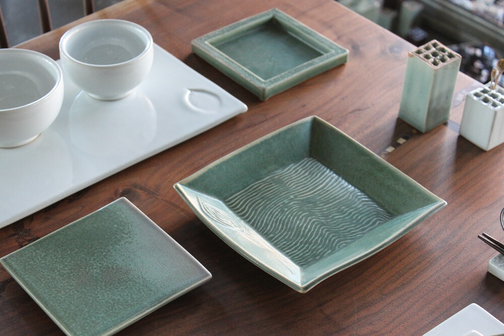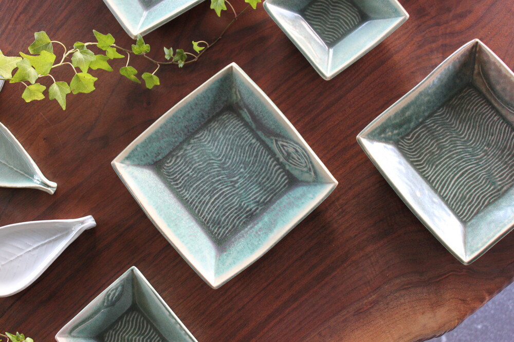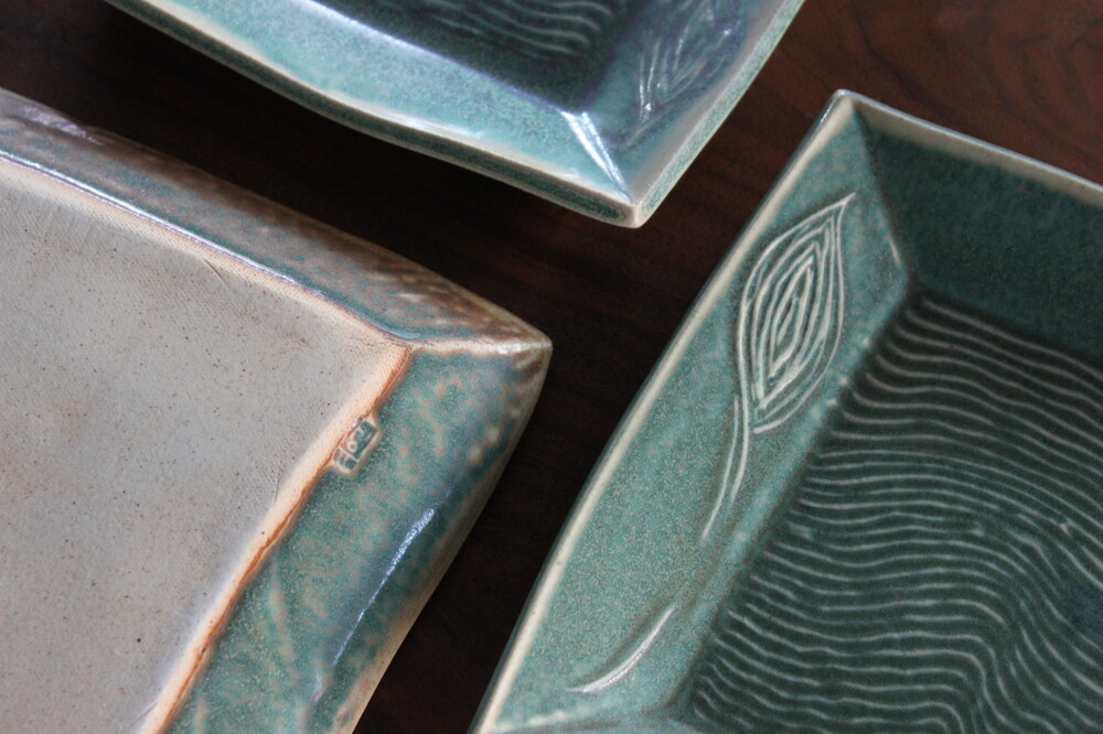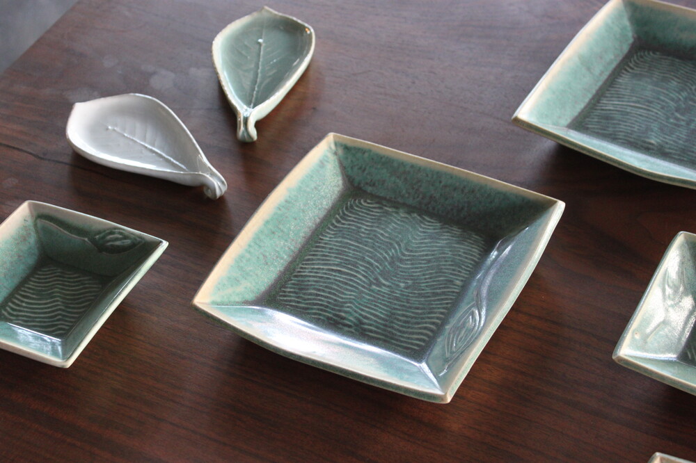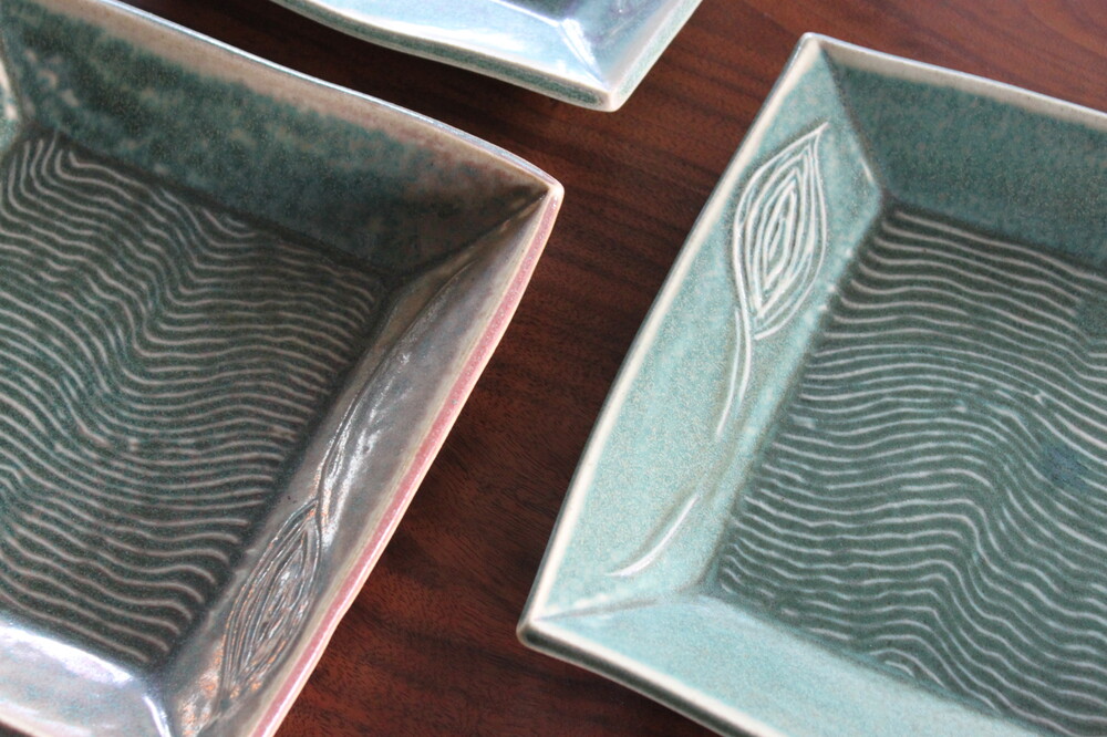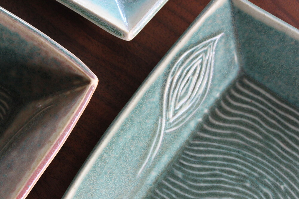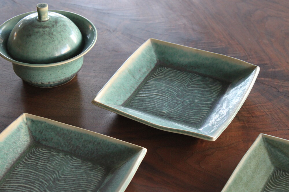 목련 꽃봉오리를 새겨놓은 깊은 그린색감의 사각접시입니다