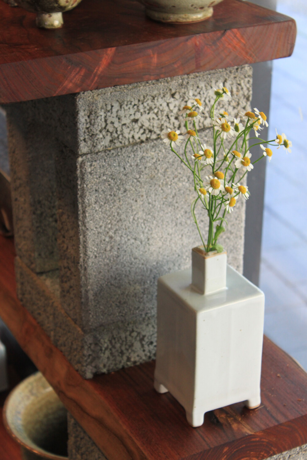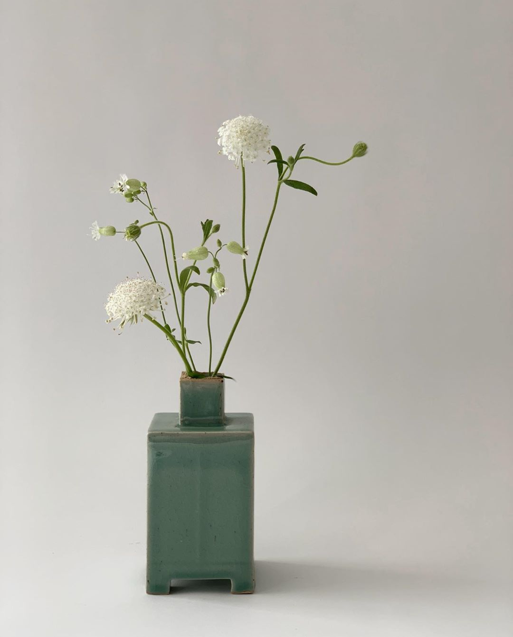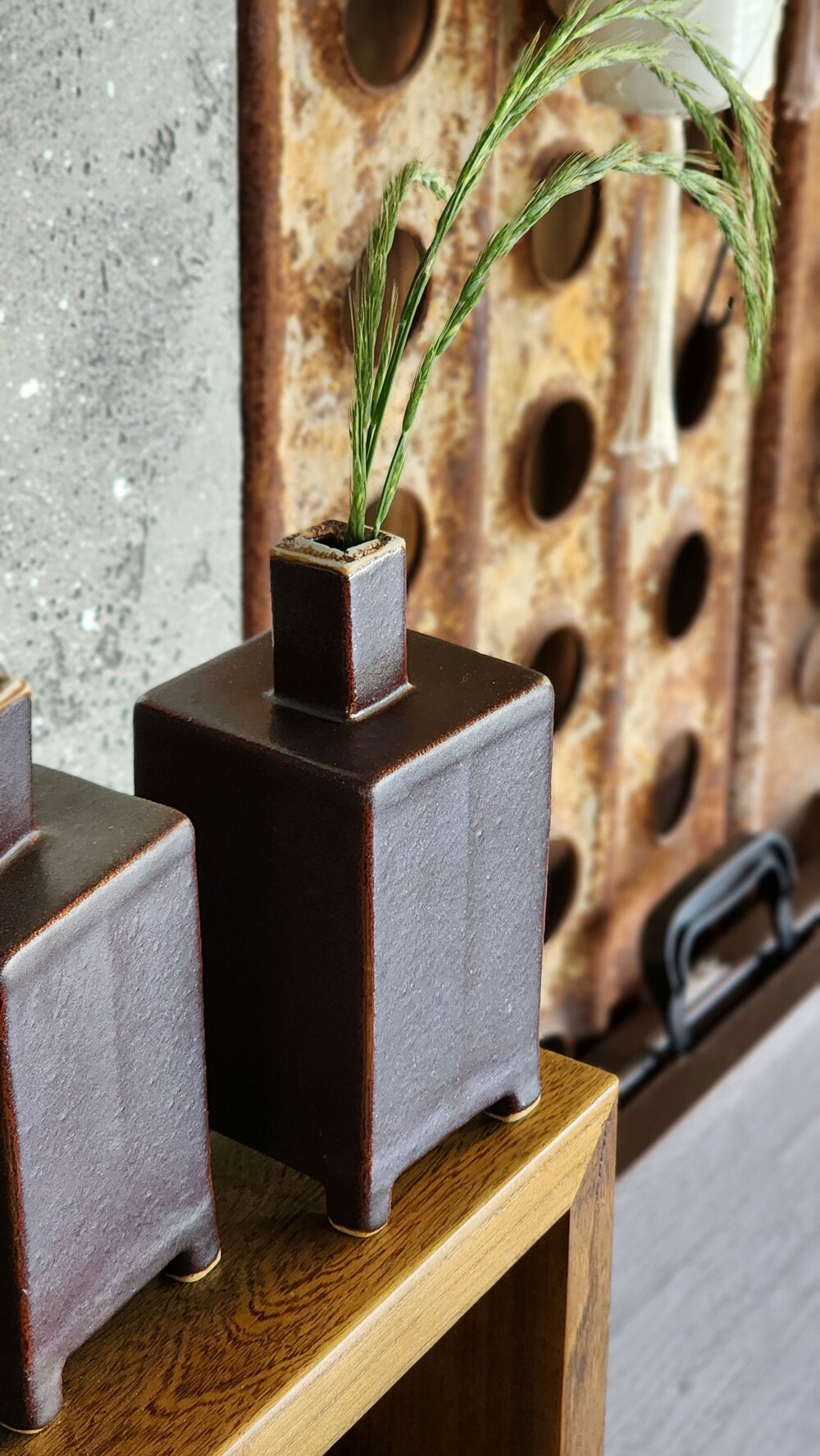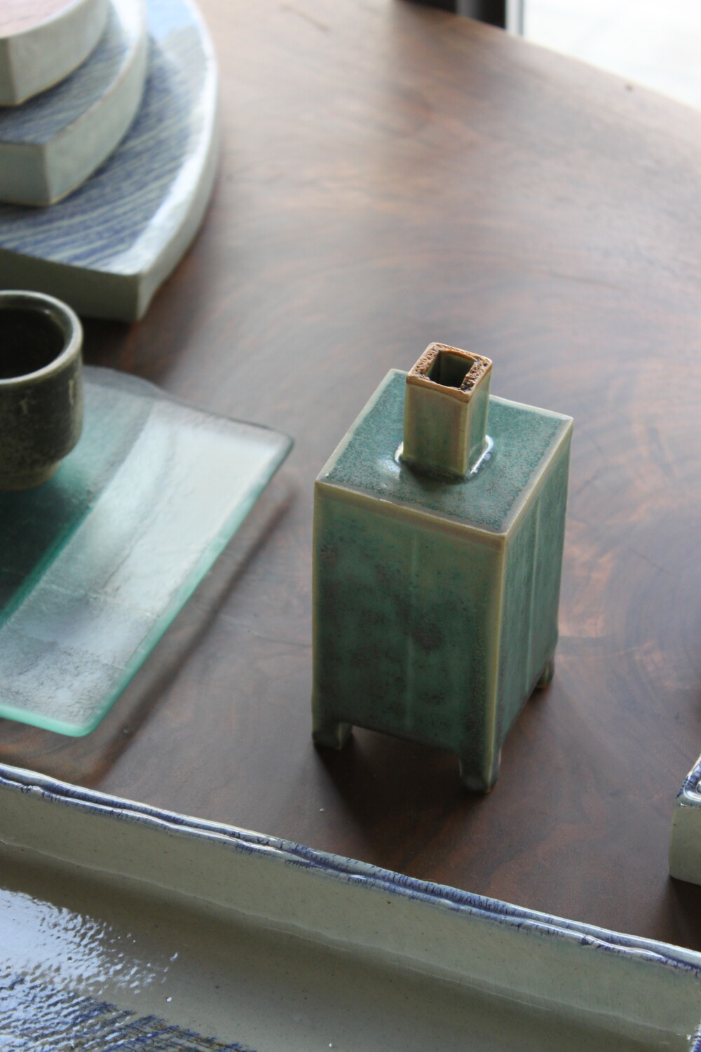 단정한 사각 형태와 우직한 존재감이 돋보이는 수공예 화병입니다.