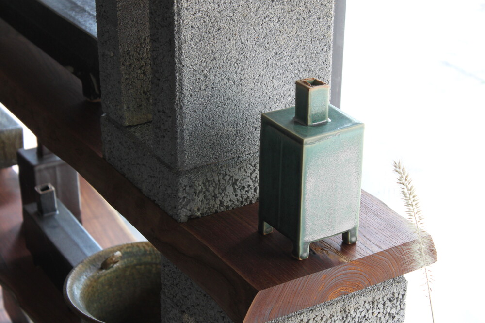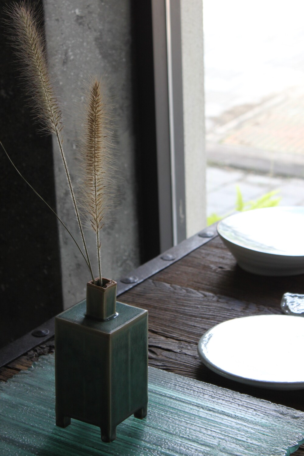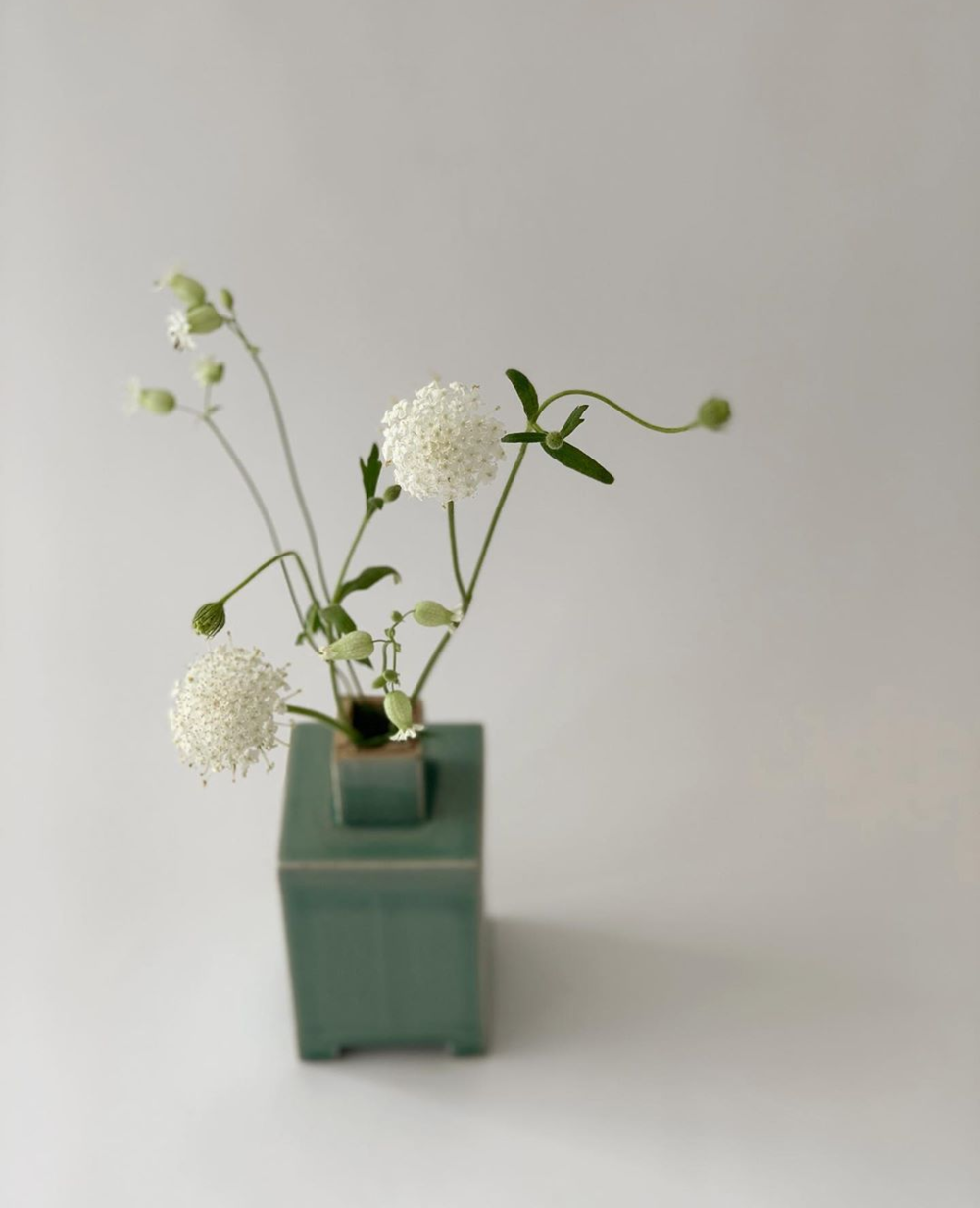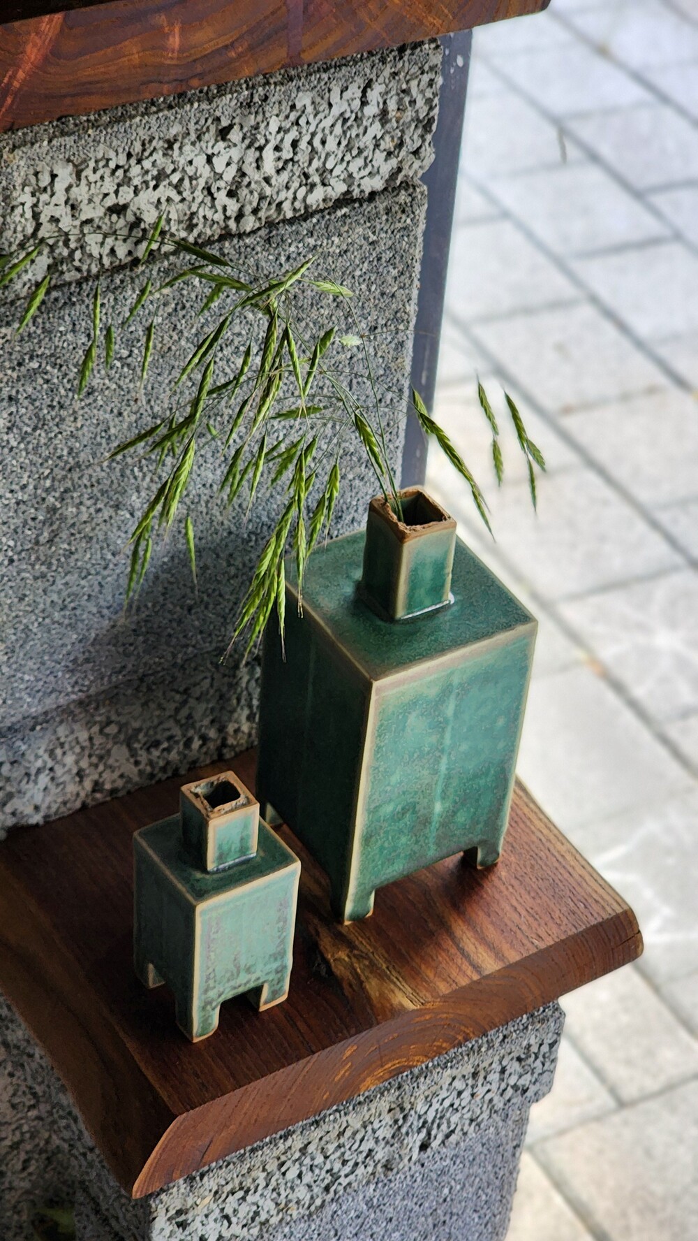 단정한 사각 형태와 우직한 존재감이 돋보이는 수공예 화병입니다.