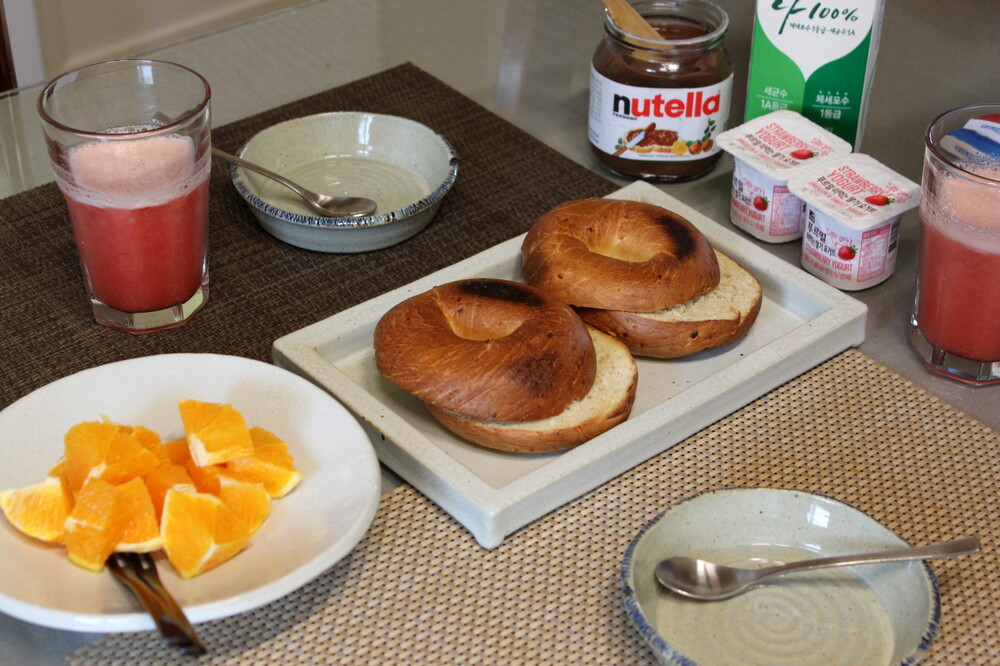 베이글 두개가 똑알맞게 담겨지는 그릇으로 브런치 테이블에 어울림이 좋겠습니다