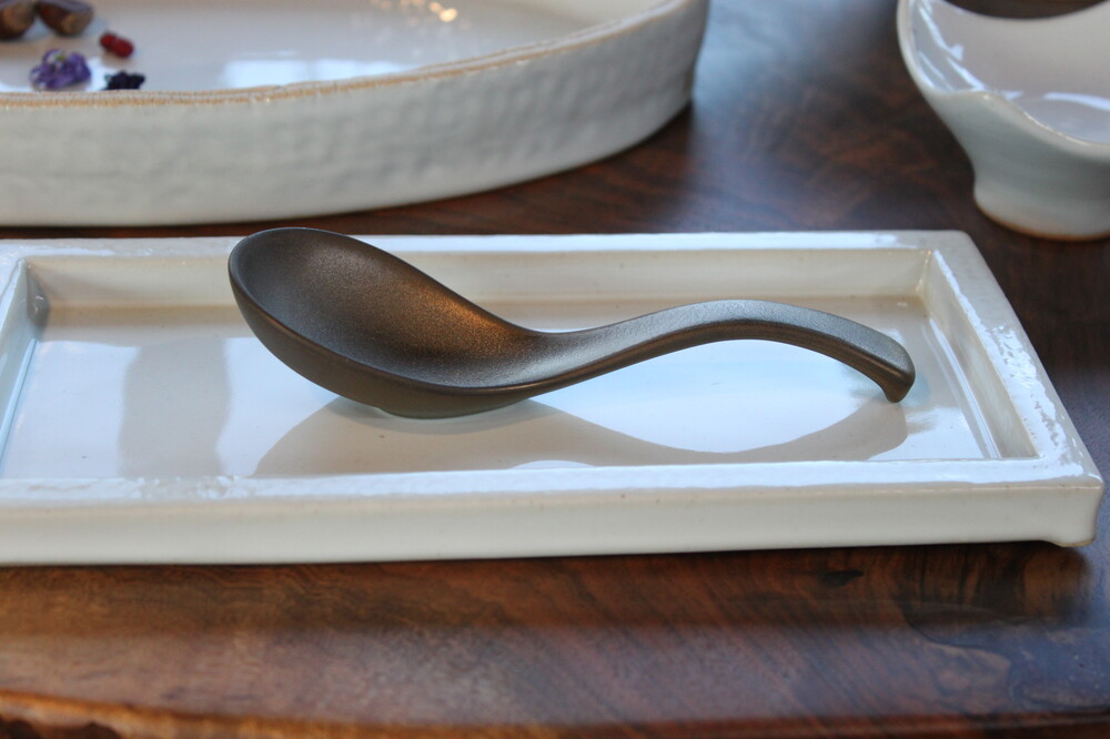 A Japanese ceramic udon spoon finished with a deep brown manganese glaze, revealing a subtle pearlescent sheen in the light.Its slightly thickened form offers a comfortable, well-balanced grip, ideal for enjoying noodle soups and broths.