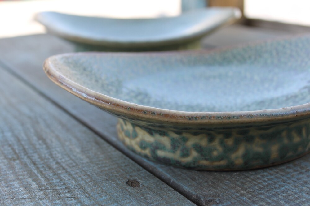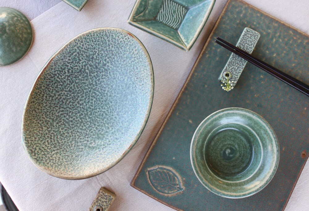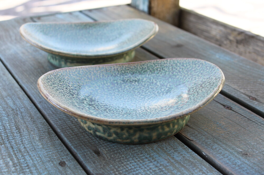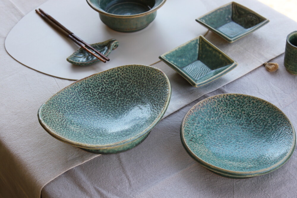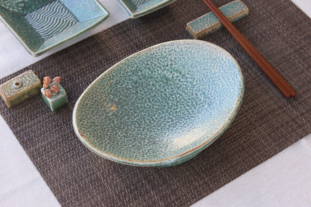 그린색의 타원굽접시는 짙은 그린색부터 베이지톤이 자유롭게 오고가는 색감입니다