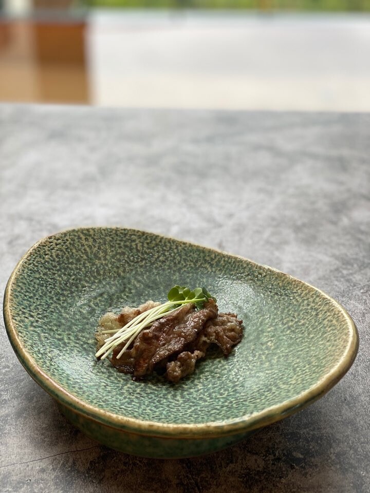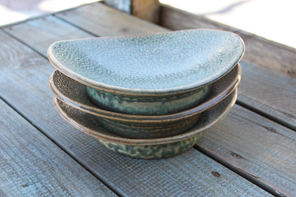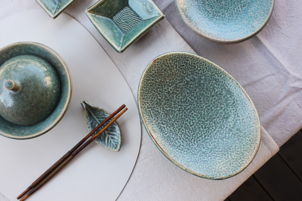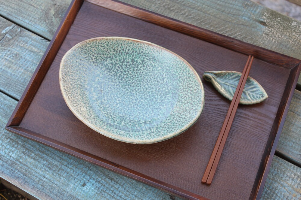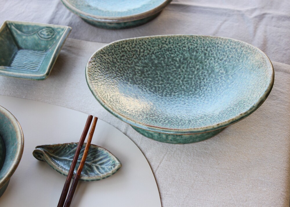 그린색의 타원굽접시는 짙은 그린색부터 베이지톤이 자유롭게 오고가는 색감입니다
