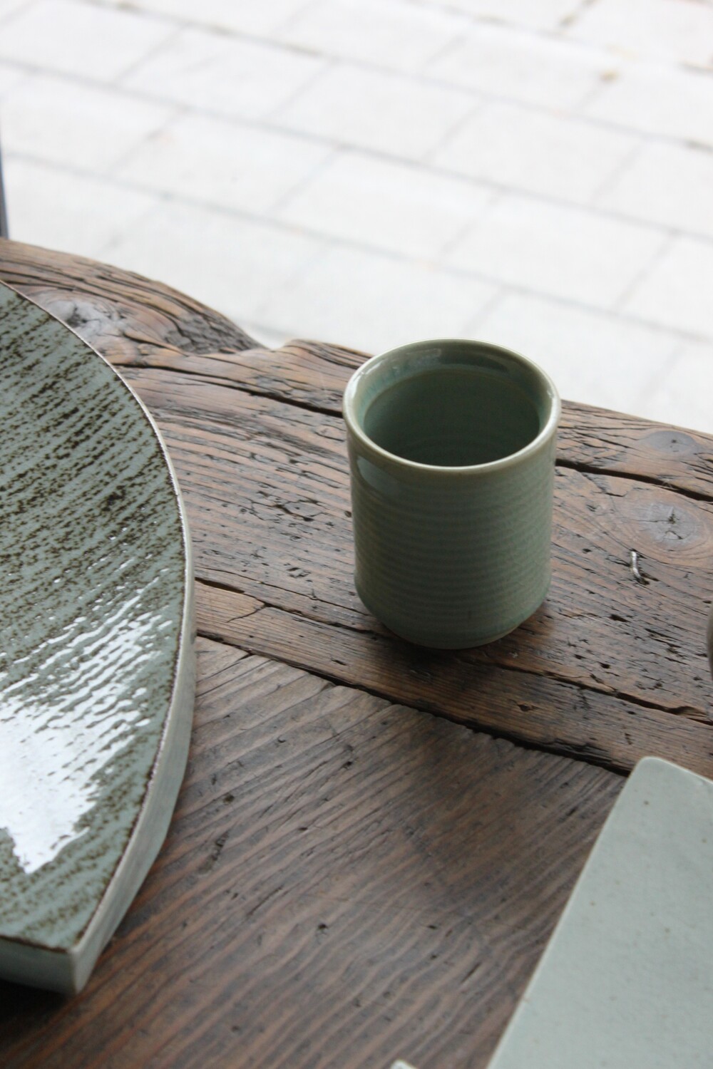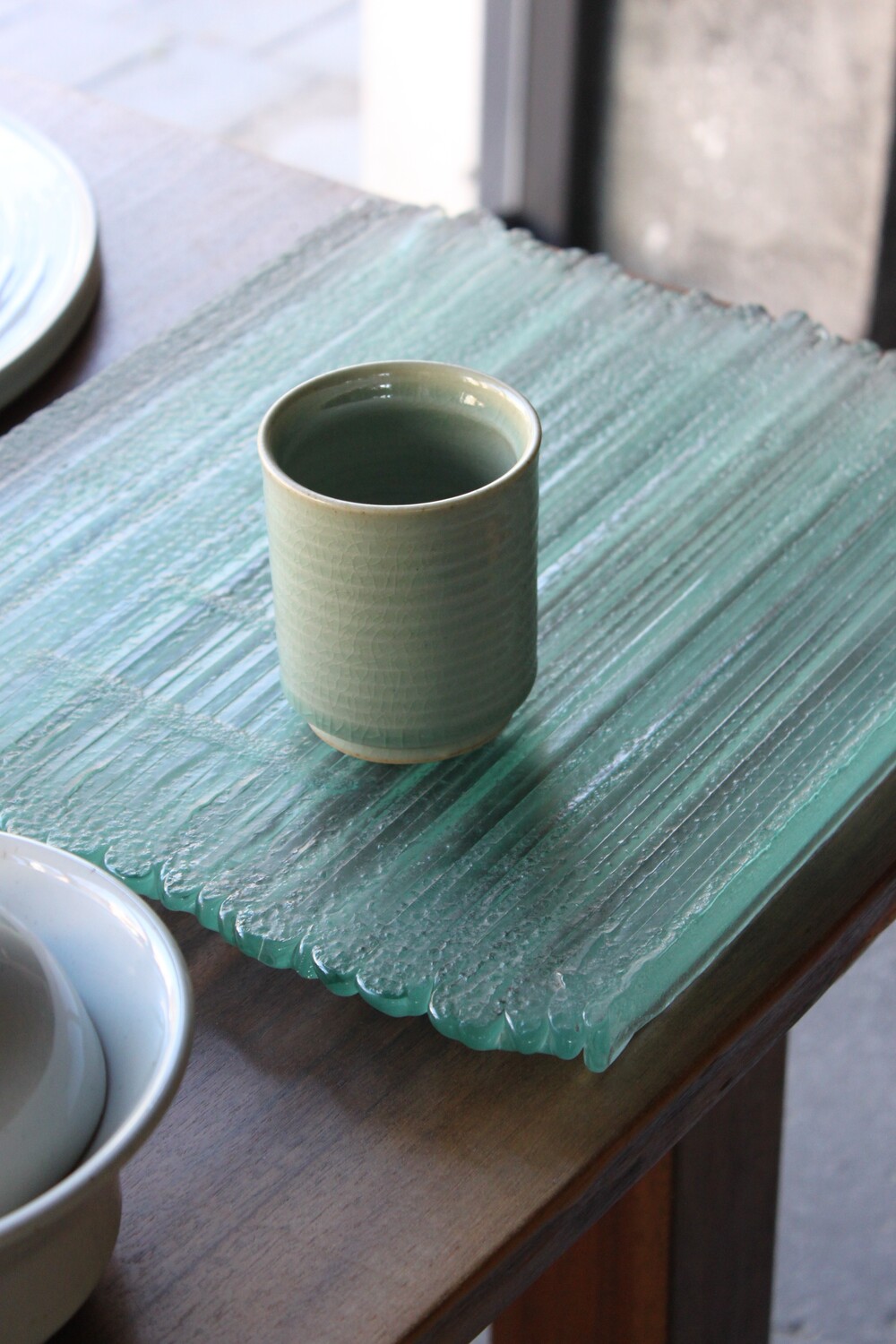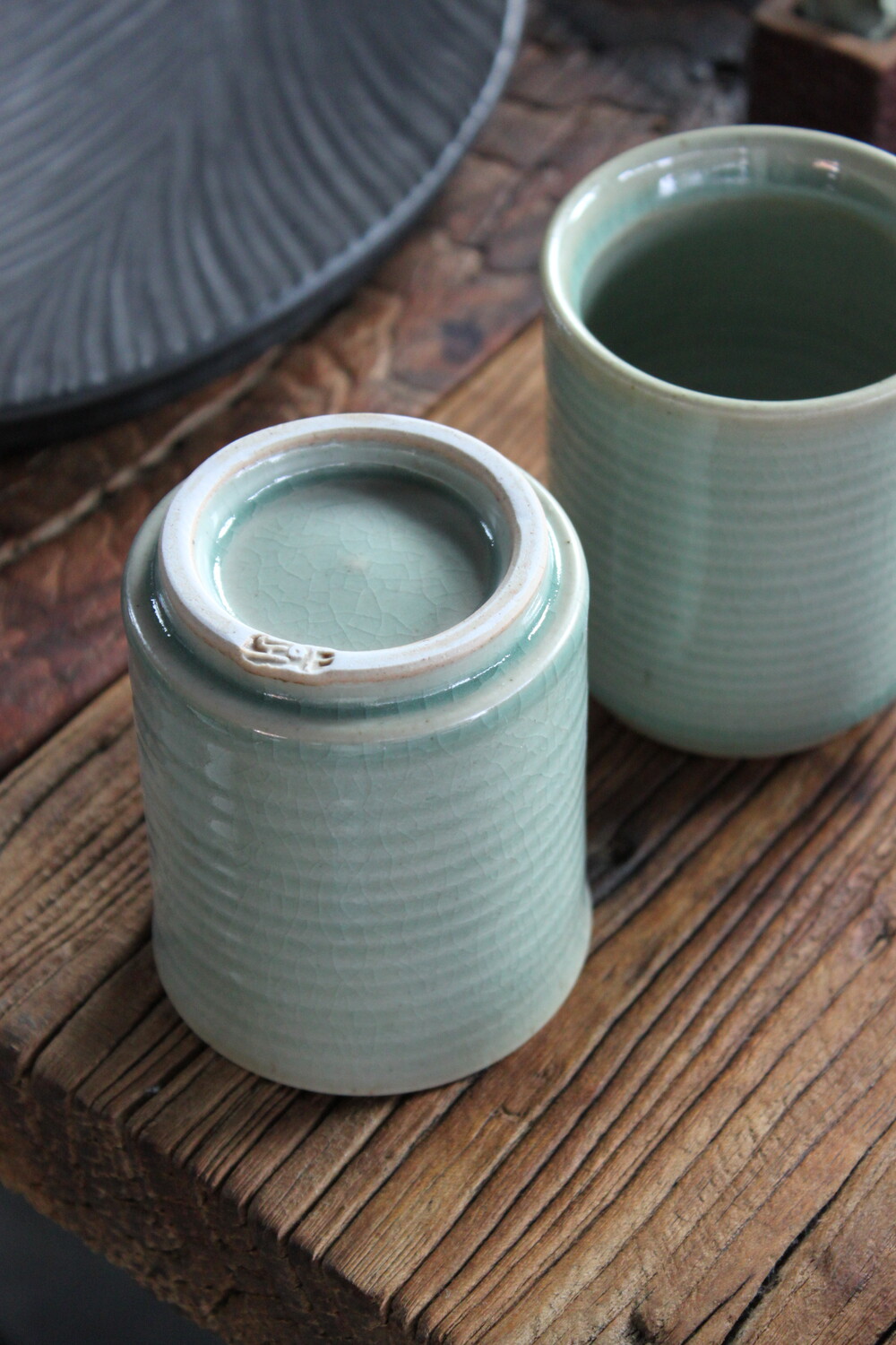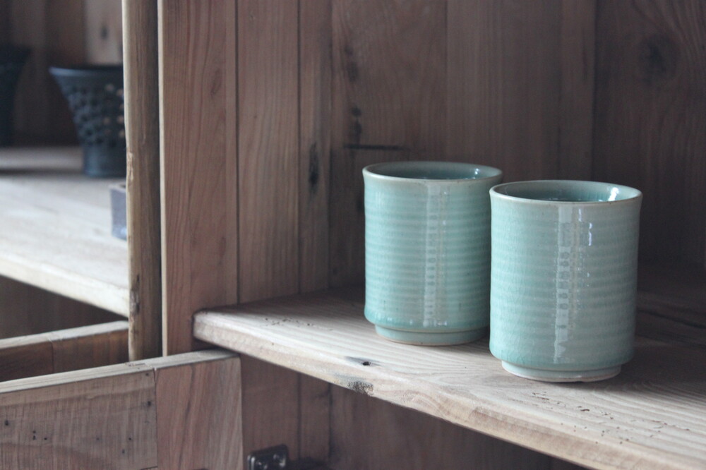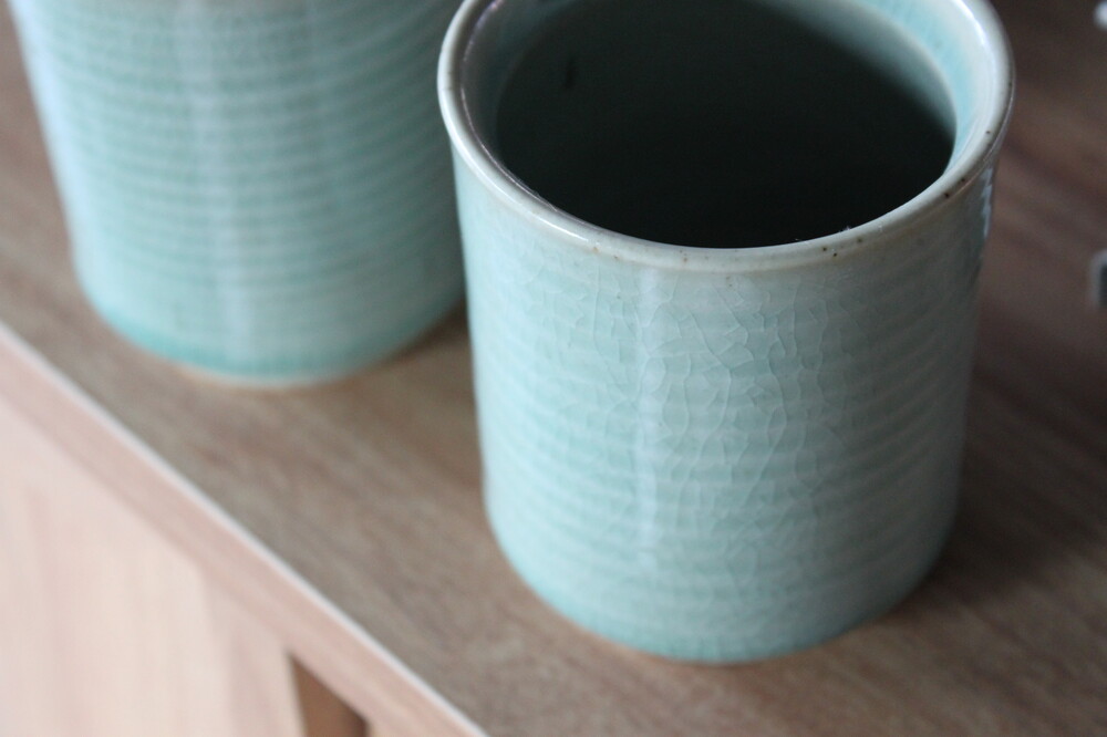 A hand-thrown ceramic cup with a clear mint celadon glazeThick, weighty, and marked by subtle wheel traces that bring quiet depth to everyday moments