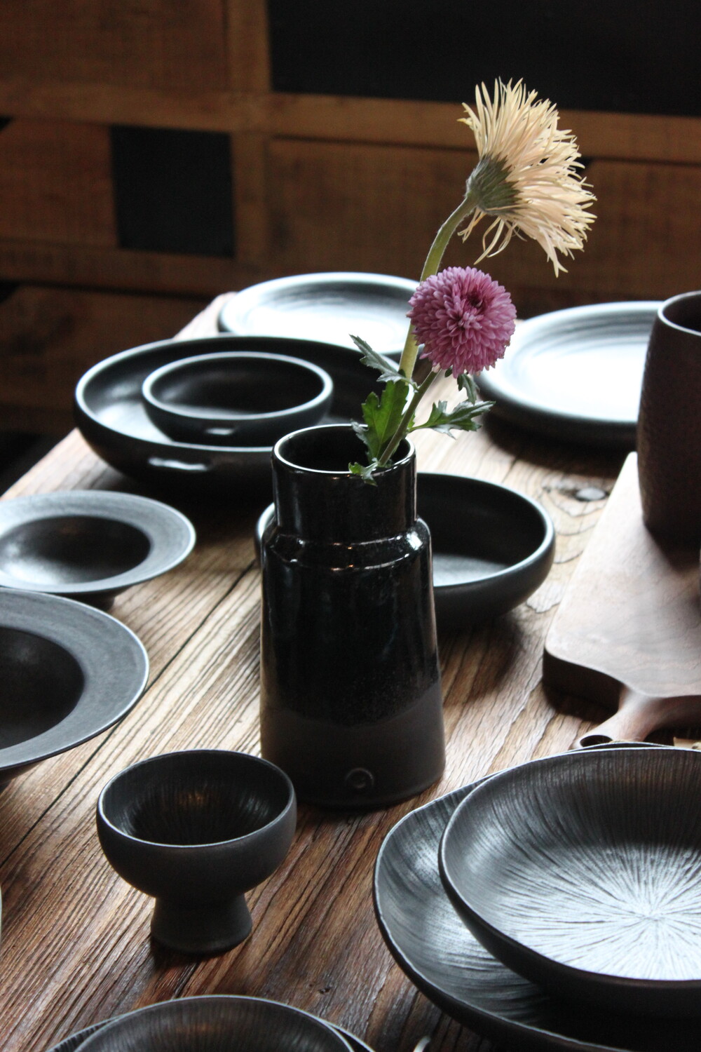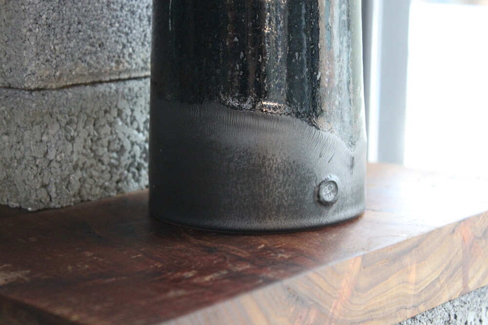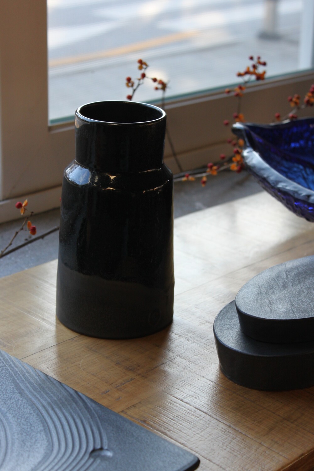 A wheel-thrown, handcrafted ceramic vasefeaturing a two-tone black glaze with a subtle cobalt sheen.