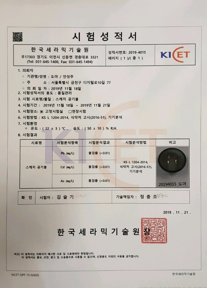 중금속 불검출 인증을 받은 친환경 도자기입니다.