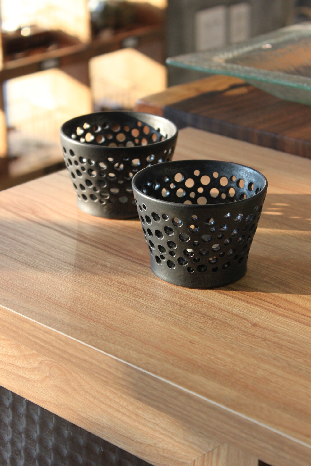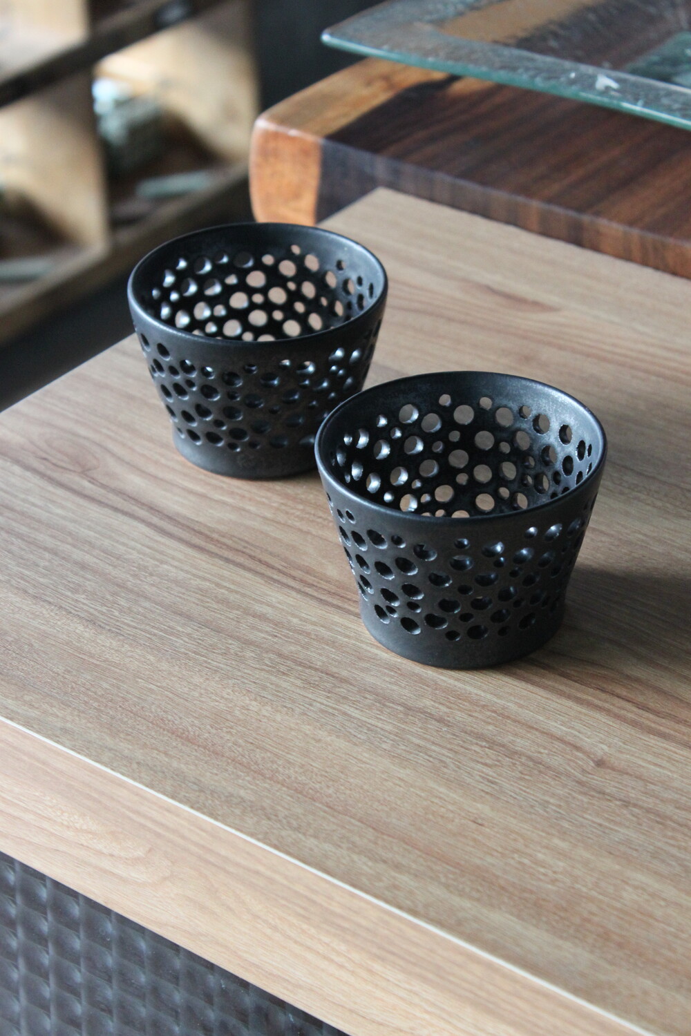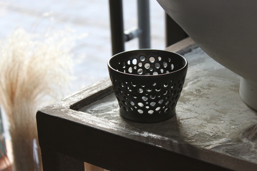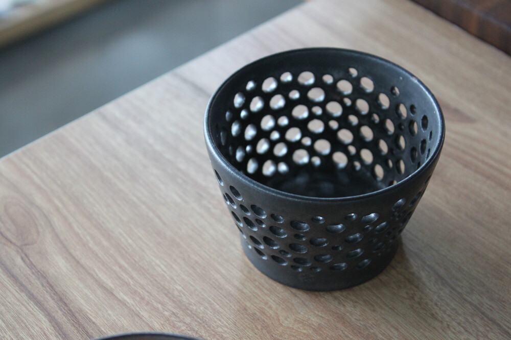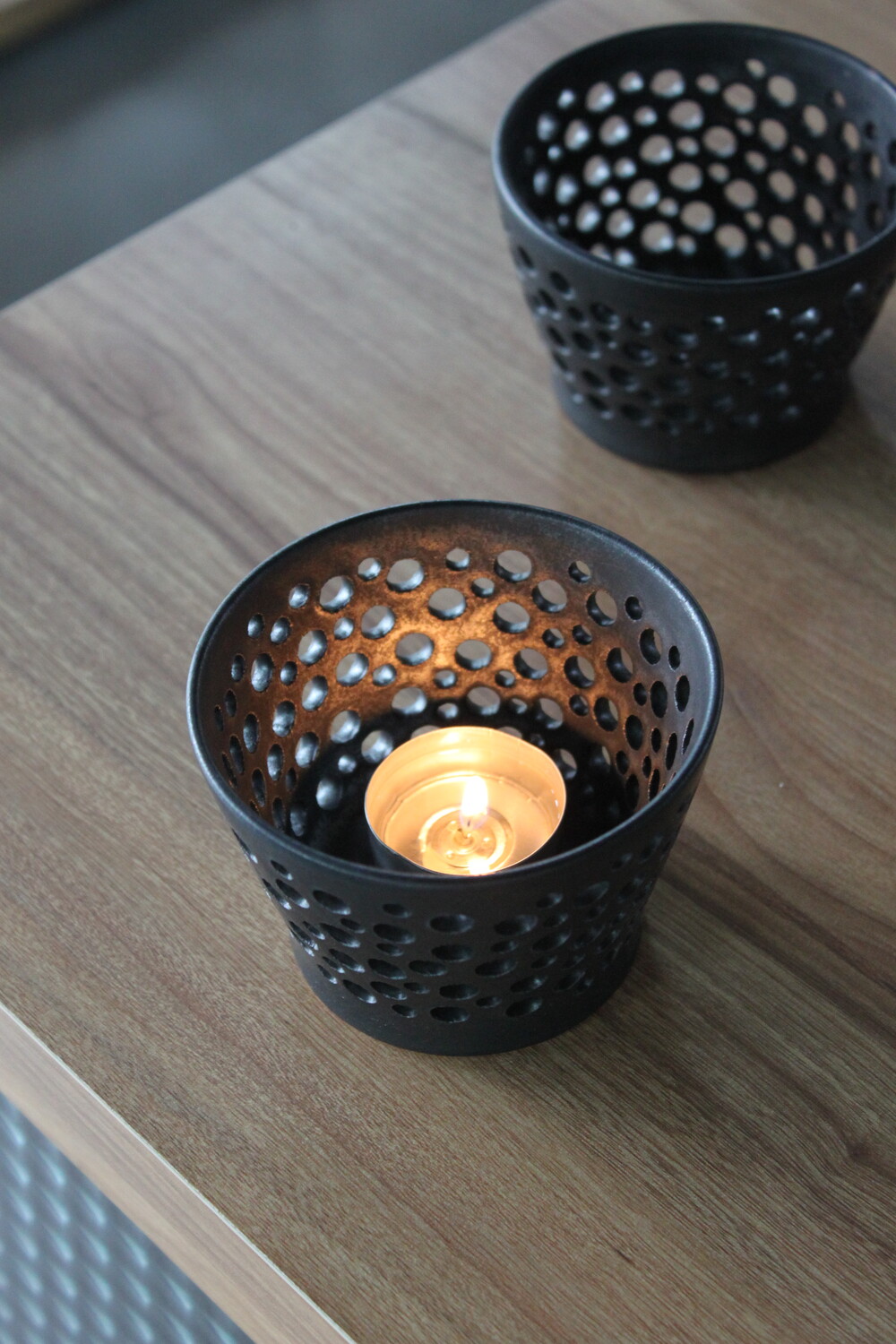 A handcrafted candle holder shaped on the pottery wheel and delicately pierced by hand.