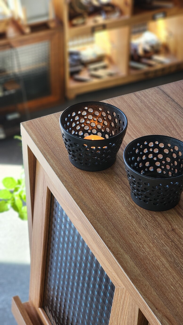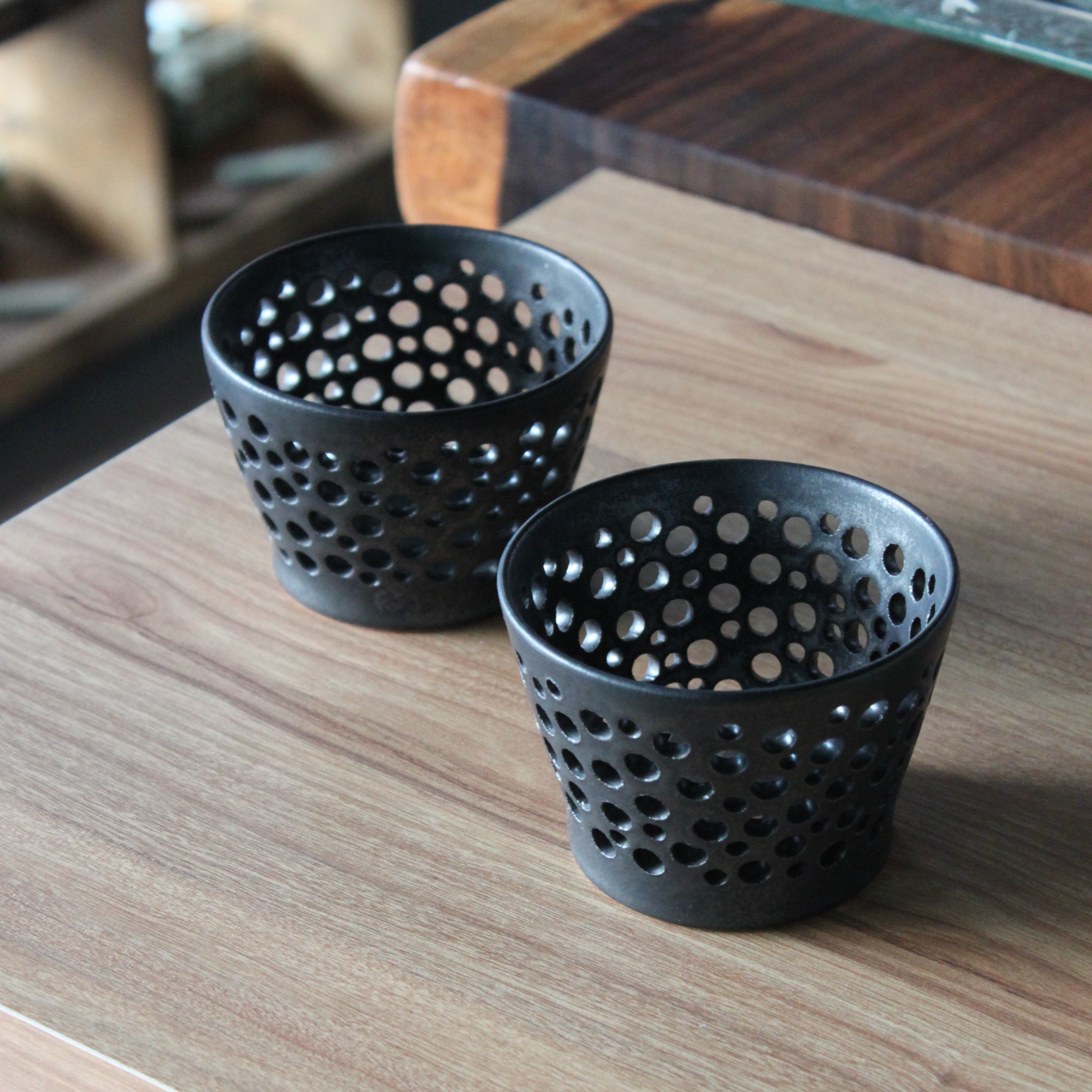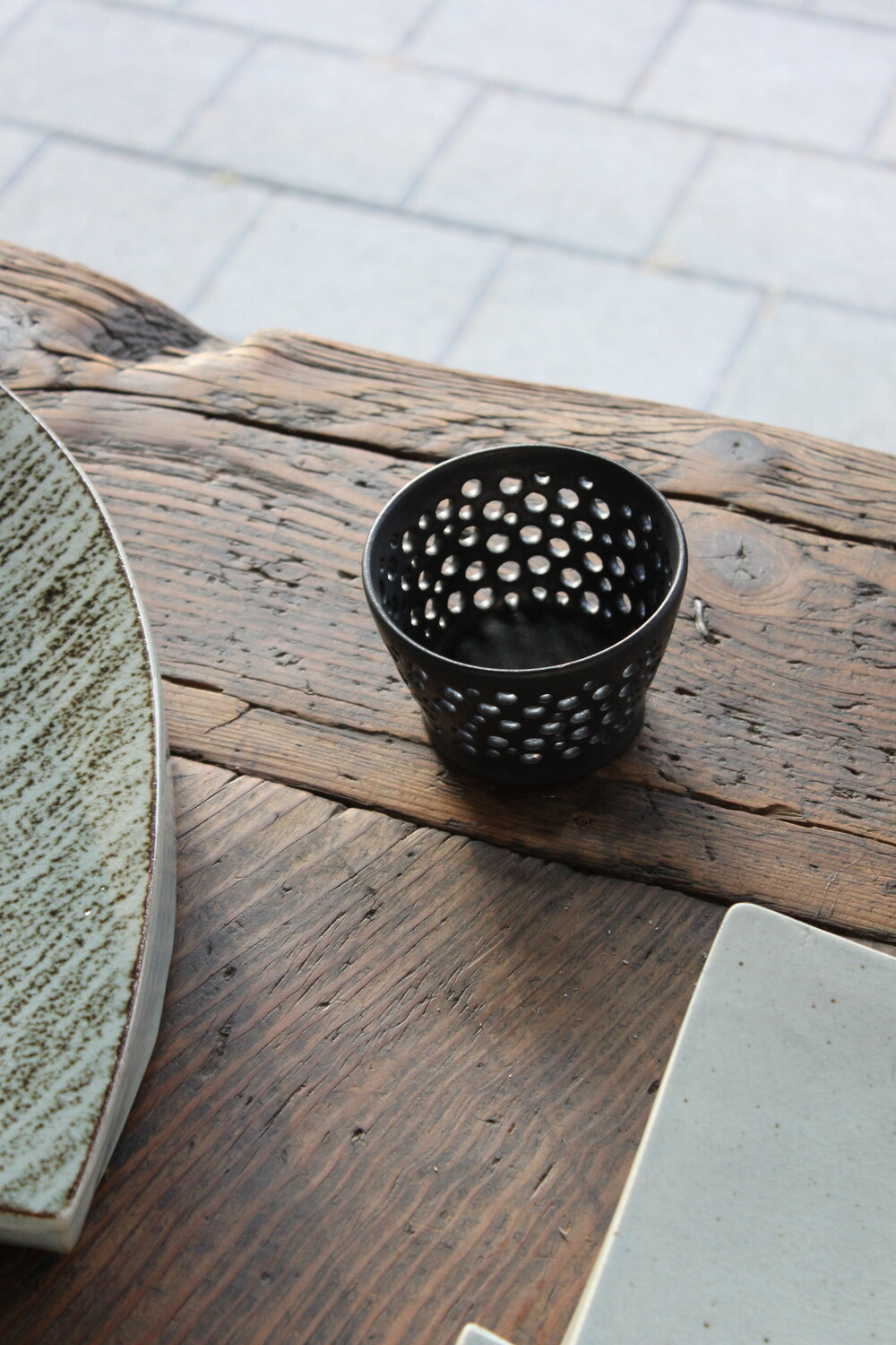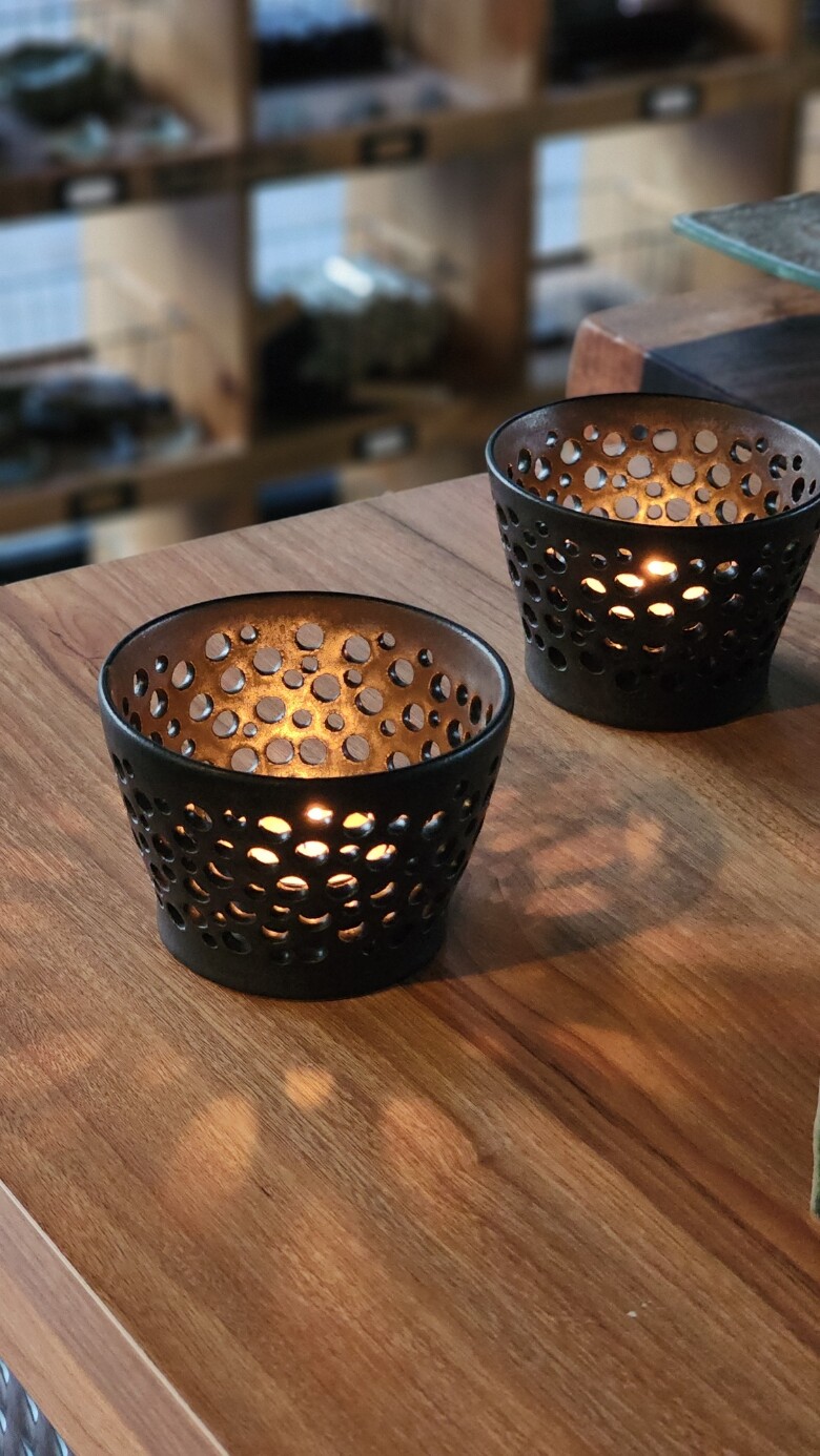 A handcrafted candle holder shaped on the pottery wheel and delicately pierced by hand.